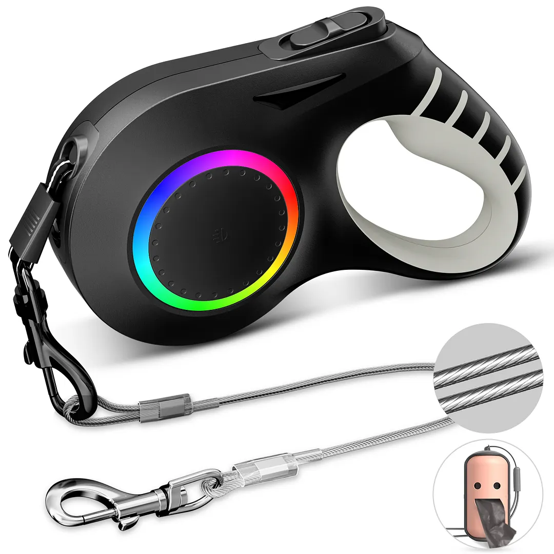 【Rechargeable Light System】Our retractable dog leash with LED light is ideal for early morning or evening walks. The front bright LED spot lamp provides excellent brightness in the dark, and the rainbow rings on both sides can switch to different color modes. The built-in USB rechargeable 600mAh battery charges in 2.5 hours for 2.5 hours of lighting. This dog leash retractable with flashlight ensures a pleasant walking experience for you and your furry friend.