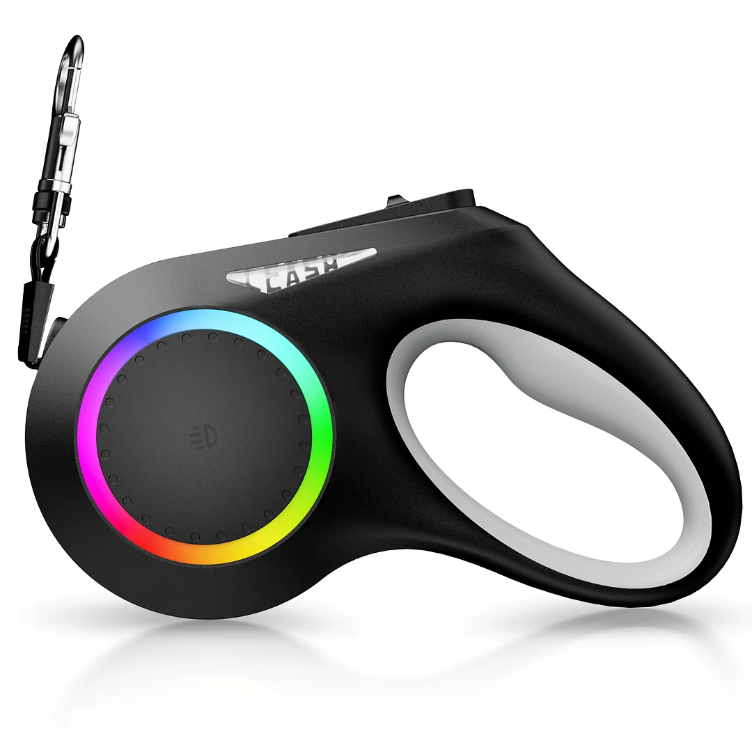 【RECHARGEABLE LIGHT SYSTEM】 This retractable dog walking leash features rainbow rings with 10 color modes (7 solid, 3 mixed) and a front LED spotlight for visibility in the dark. This retractable dog walking leash includes a built-in 600mAh rechargeable battery, charged via Type-C cable, and lasts over 2.5 hours.
